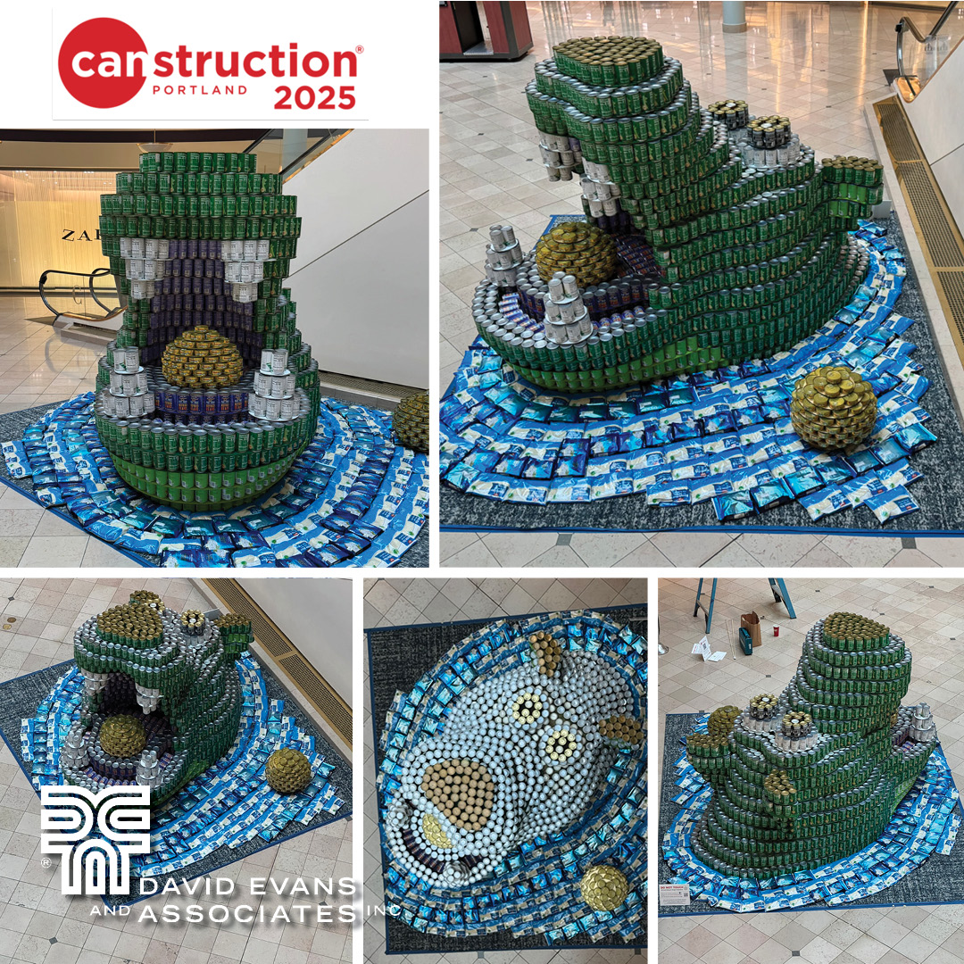 DEA, Hennebery Eddy Architects, and Mortenson participated in the 2025 Portland CANstruction competition, creating a “Helpful Hungry Hippo.” The sculpture is comprised of  3,181 cans made up of proteins, fruits, vegetables and legumes, all of which were  donated to the Oregon Food Bank after the competition. Our design earned the Best Original Design (top award), Structural Ingenuity, and People’s Choice awards, and our Mission Statement was: